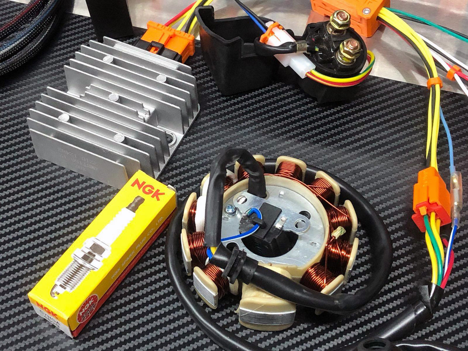 No splicing or soldering to install. Complete all-in-one harness and parts system, rip out that old rats nest and replace it with clean USA-made wiring no matter which GY6 kart you have.